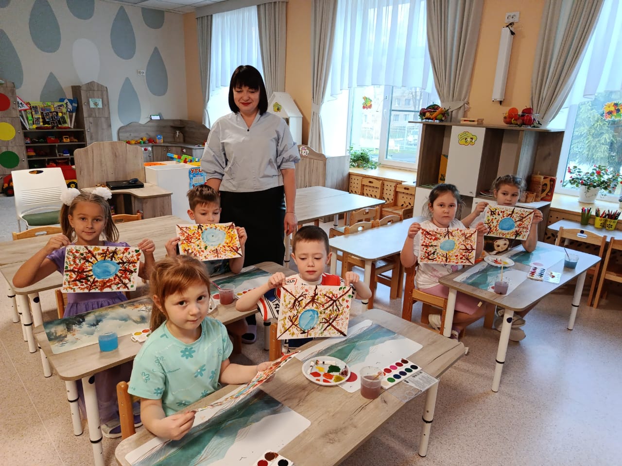 В детском саду «Ивушка» в группе «Красота Божьего мира» прошло открытое занятие на тему «Осень». Мы с ребятами разговаривали об осени и её признаках. Затем представили, что мы летим на воздушном шаре и сверху видим осенний красочный лес. Ребята с большим энтузиазмом приступили к работе и начали рисовать осенний лес, используя в работе ватные палочки в технике тампонирования, и создали яркие и красочные рисунки. В результате художественные работы получились красочные, яркие и выразительные, отражающие осеннюю тематику.